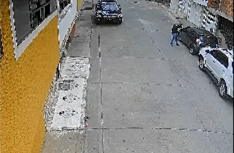 Las imágenes captadas por una cámara de seguridad dejan en evidencia que cuando el comerciante intentó parquearse para descender del vehículo y entrar a la vivienda, el maleante bajó de la moto en la que se movilizaba, los sorprendió por la ventana del conductor y le pidió que le entregara la plata mientras lo apuntaba.