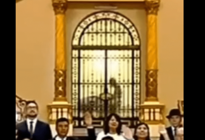 Y fue precisamente en el acto de juramento de los nuevos funcionarios, que se vivió un hecho particular que se ha vuelto viral en redes sociales. Detrás de Castillo y los nuevos ministros, un suceso extraño se podía ver de fondo, pues los cristales reflejaban unas inusuales sombras de una pareja, al parecer, ‘dándose amor’.