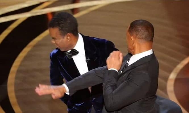 Will Smith sin titubeo alguno subió al escenario, caminó lentamente y con una irónica sonrisa en su rostro no titubeó para abofetear al comediante. Luego dio media vuelta y volvió a su silla; desde allí expresó: «Mantén el nombre de mi esposa fuera de tu p€¥a boca».