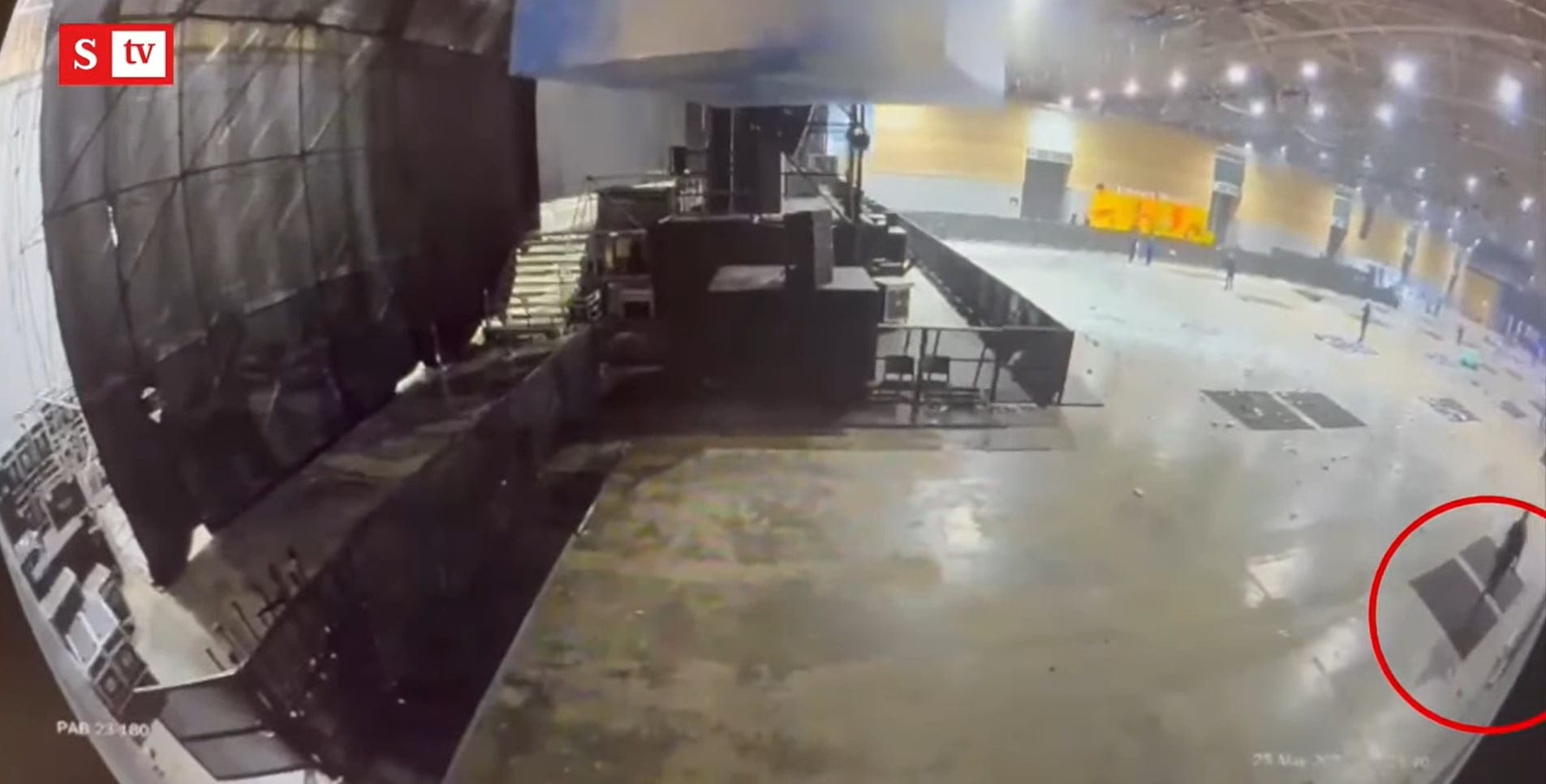 En un segundo momento, las cámaras registraron a Carlos David escalando los andamios ubicados detrás de la tarima. Utilizando hábilmente las diferentes secciones de esta estructura, logra elevarse hasta una altura de aproximadamente dos metros. Desde esa posición, sin titubear, se lanza de cabeza al suelo.